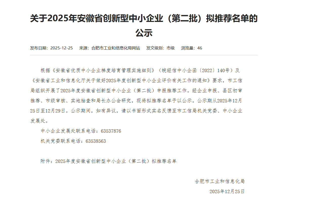 喜訊 | 祝賀我司榮獲2025年度安徽省“創(chuàng)新型中小企業”稱號